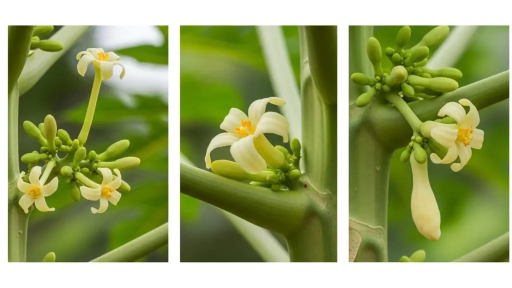 | Macho | Flores em longos cachos (pendúnculos) pendurados. | Raramente produz. Se produzir, é deformado (mamão corda). | Nulo (serve apenas para polinização). |
